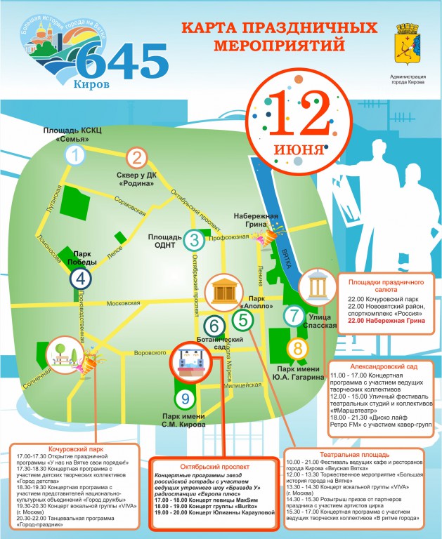 Так, на Театральной площади в 10.00 начнется фестиваль ведущих кафе и ресторанов областного центра «Вкусная Вятка». В течение дня здесь можно будет принять участие в детских мероприятиях, различных мастер-классах и кулинарных шоу.